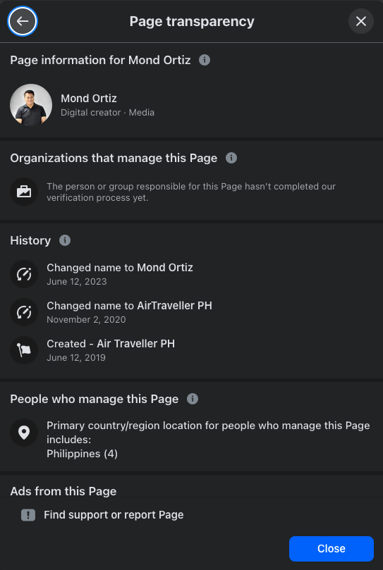 Recently, the same post resurfaced in our Facebook timeline, prompting us to revisit the status of the page involved. Upon checking its page history, we discovered that AirTraveller PH is now operating under the name “Mond Ortiz.” Records show that the Facebook page was officially renamed on 12 June 2023. While page renaming is a standard feature on the platform, this development is relevant given the unresolved concerns surrounding the earlier plagiarism incident.